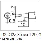{T12-D08 Shape-0.8D}{T12-D12 Shape-1.2D}{T12-D12Z Shape-1.2D(Z)}{T12-D16 Shape-1.6D}{T12-D16Z Shape-1.6D(Z)}{T12-D24 Shape-2.4D}{T12-D24Z Shape-2.4D(Z)}{T12-D4 Shape-4D}{T12-D4Z Shape-4D(Z)}{T12-D52 Shape-5.2D}{T12-DL08 Shape-0.8DL}{T12-DL12 Shape-1.2DL}{T12-DL32 Shape-3.2DL}{T12-DL52 Shape-5.2DL}{T12-WD08 Shape-0.8WD}{T12-WD12 Shape-1.2WD}{T12-WD16 Shape-1.6WD}{T12-WD52 Shape-5.2WD} - This shape is capable of any soldering by placing the tip end in 2 ways: line and face. Therefore it requires soldering skill.